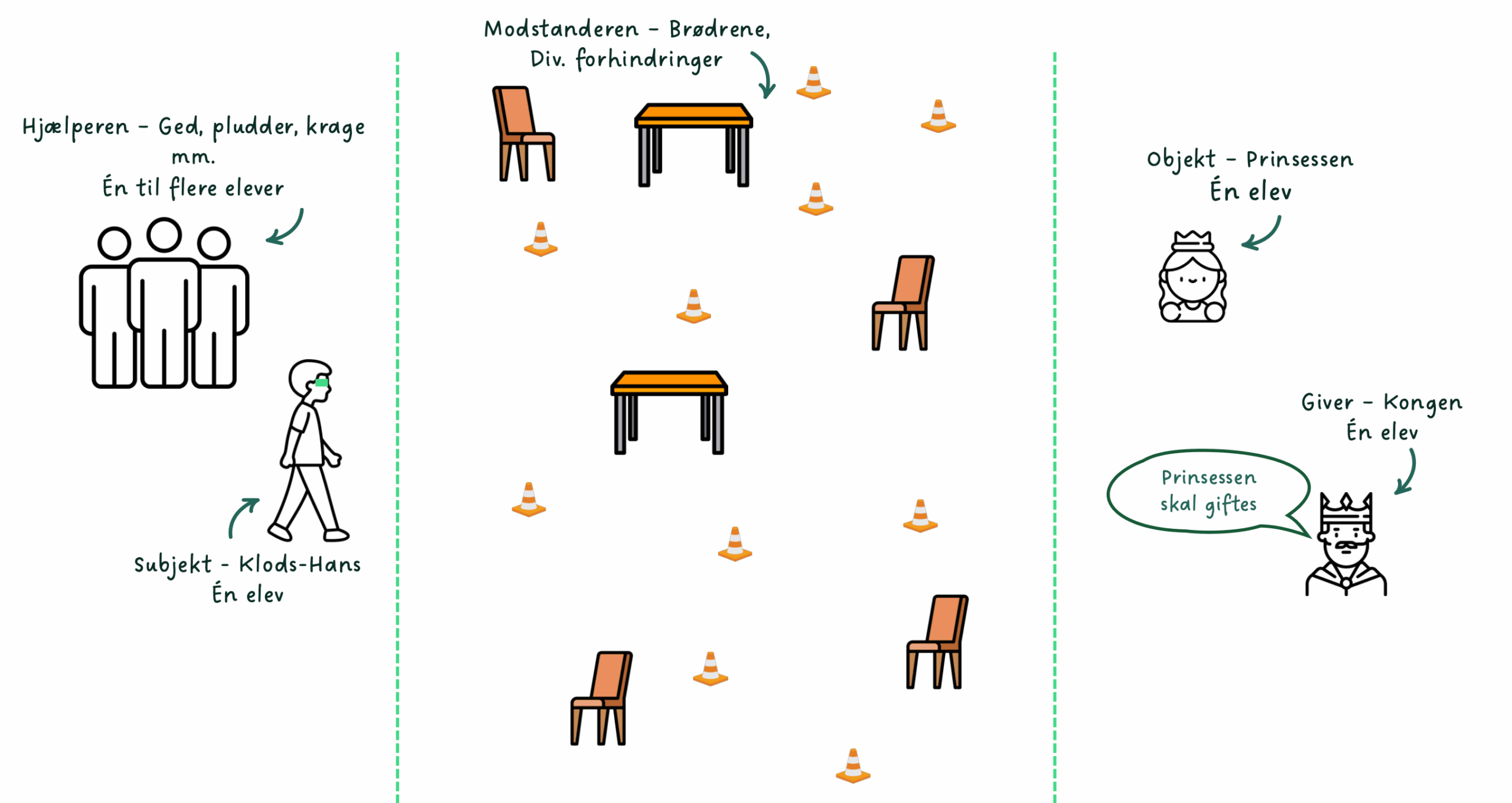 Formålet er, at eleverne erfarer aktantmodellens roller ved at bruge kroppen og aktivt leve sig ind i fortællingen.