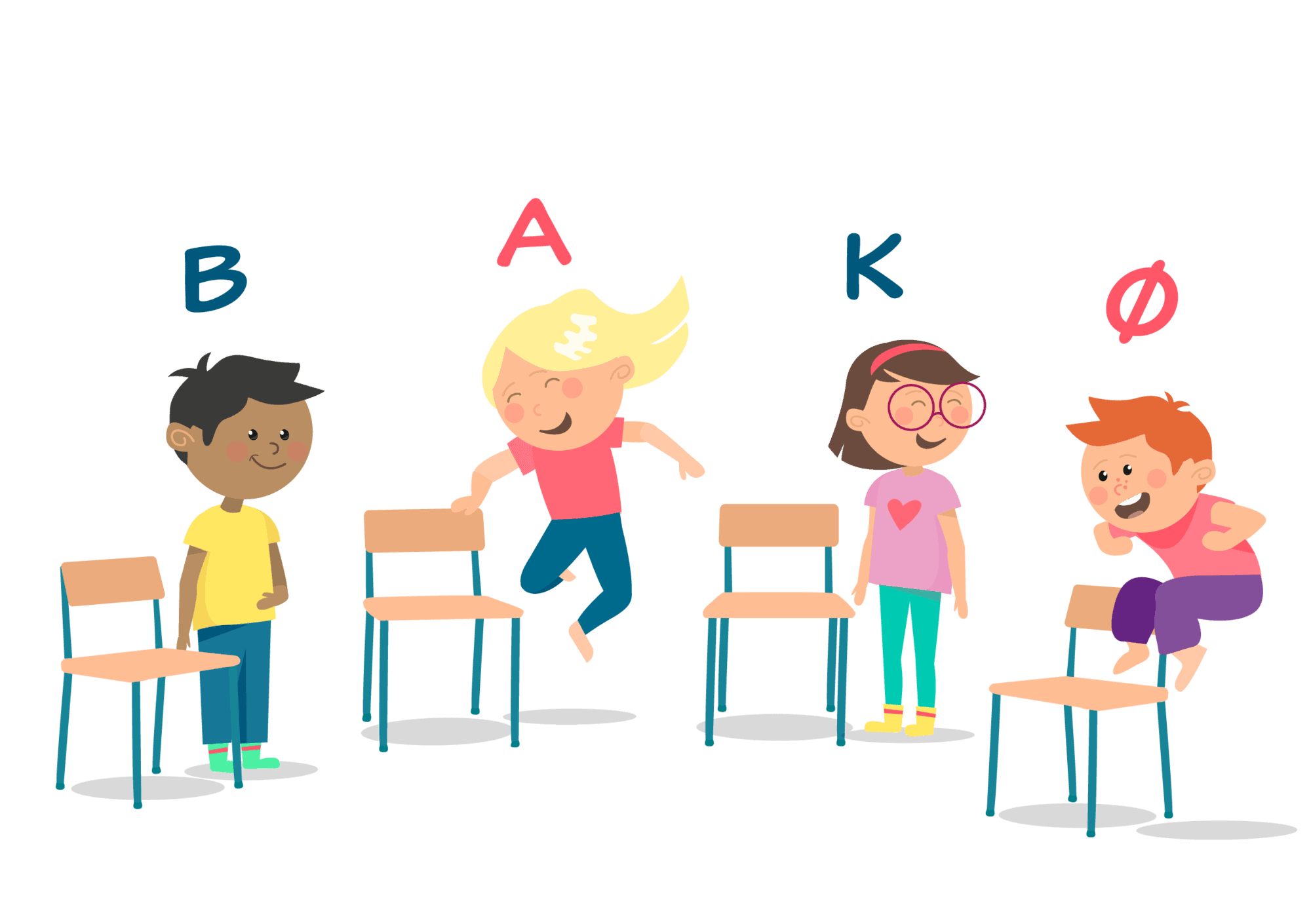 - Underviseren siger nu fx ”Alle dem med et rødt bogstav (vokal) drejer rundt om sig selv fem gange” eller ”Alle dem der har et bogstav, som indgår i HUS, laver en kolbøtte”, hvorefter alle de elever, der har et bogstav, som passer til udsagnet, følger kommandoen.