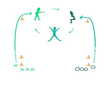 - Én deltager fra hvert hold løber langs kanten af banen, indtil de mødes overfor hinanden.