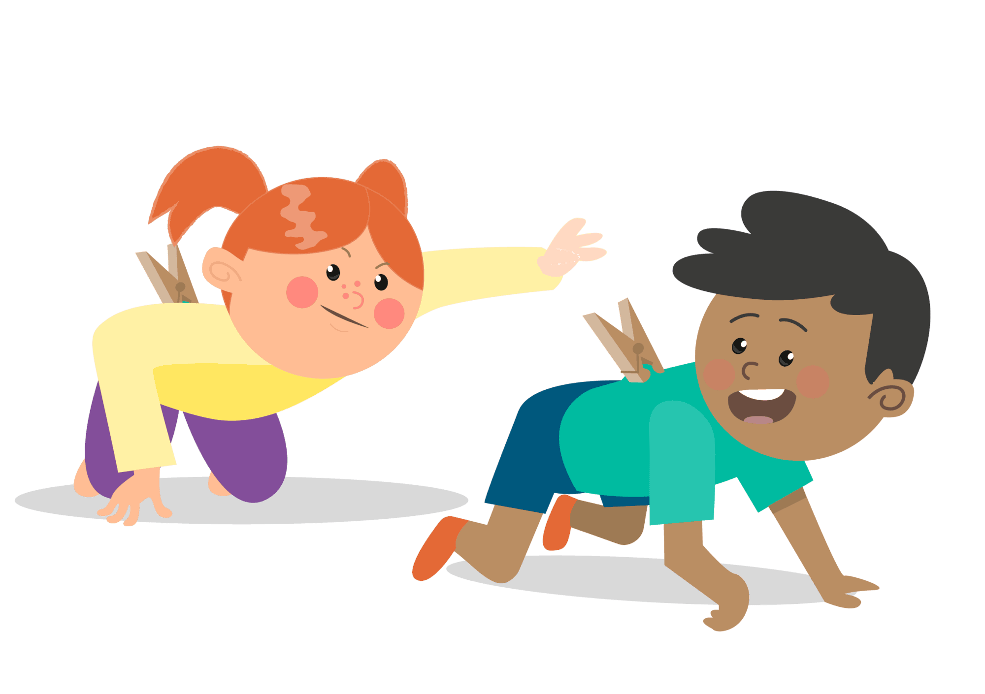 - Eleverne placerer en klemme på hinandens ryg, fordeler sig rundt i lokalet og skal kravle rundt på hænder og knæ.