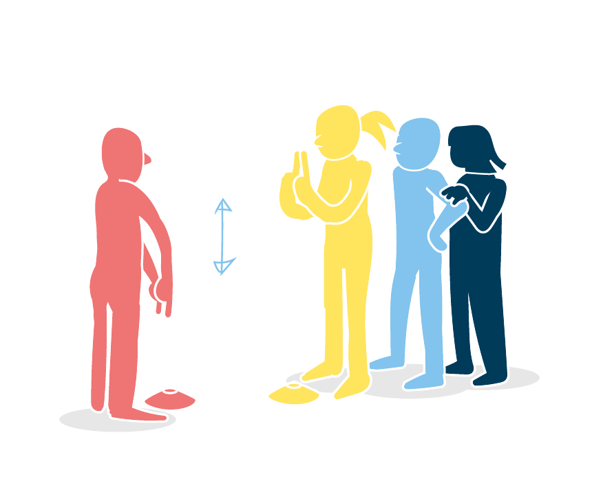 - For endnu mere bevægelse kan man vise den valgte retning med større dele af kroppen. Det kan fx være højre ben for at vise højre, strakte arme for at vise op, sætte sig i hug for at vise ned, og venstre ben for at vise venstre. Hvis eleverne har svært ved øjenkontakt, kan de stå med ryggen til hinanden og fx vælge mellem klap eller tramp.