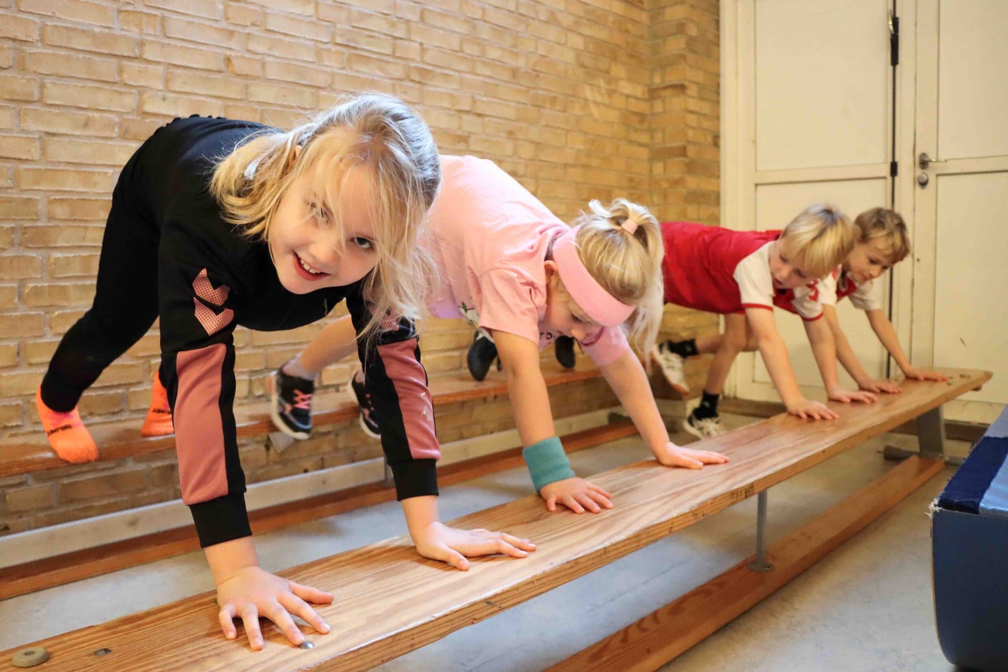 - Herefter vælger eleverne et redskab fra redskabsrummet og hjælper med at stille det op i salen/hallen. I må gerne tømme redskabsrummet, så der er mange forskellige muligheder, fx madrasser, bukke, skamler, måtter, springbræt, bænke, plint mm.
