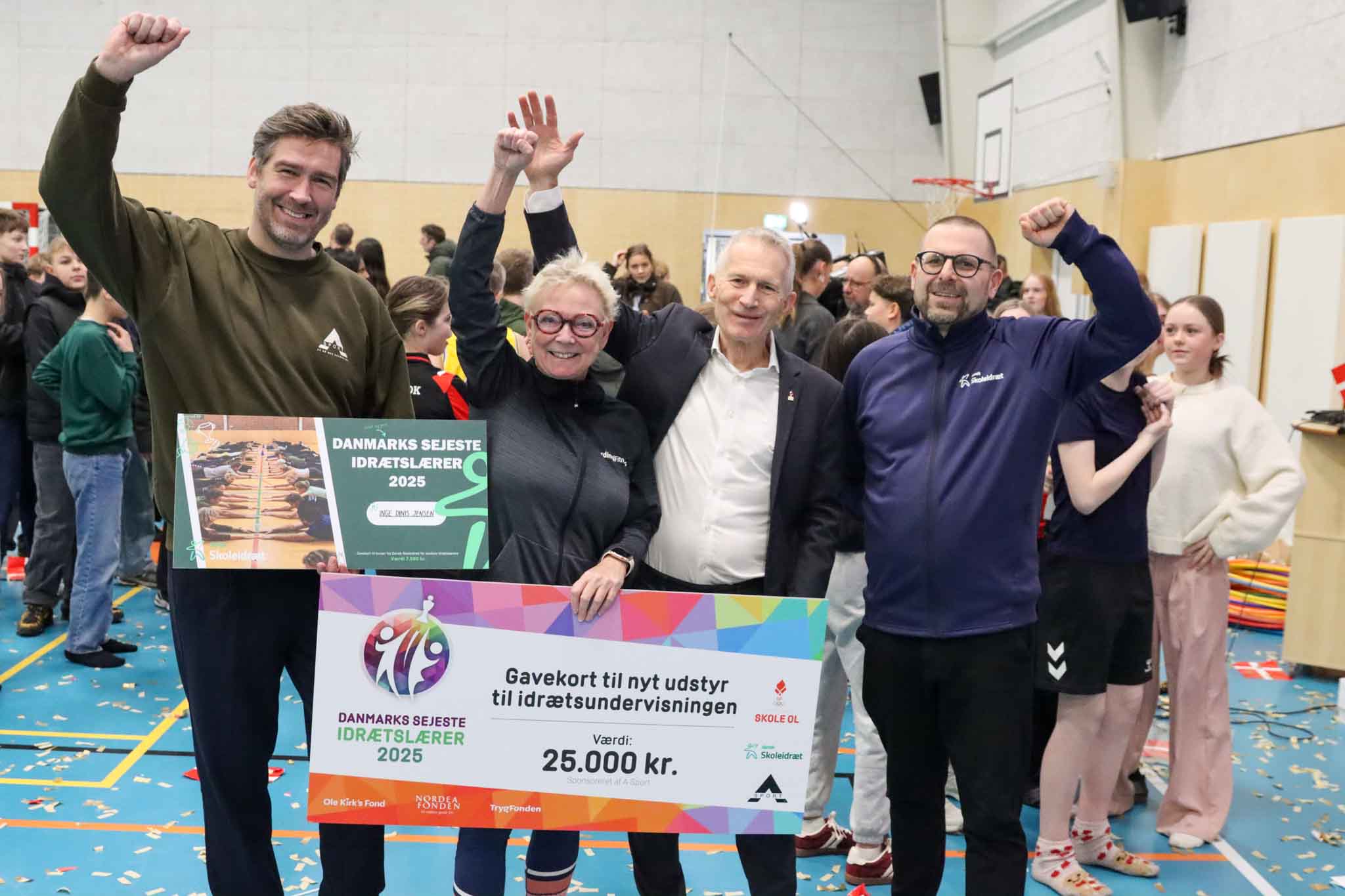 62-årige Inge Dinis Jensen fra Ikast Østre Skole blev tirsdag overrasket med flag, jubel og konfetti midt i en idrætstime af skolens 700 elever. Det skete, da hun fik overrakt prisen Danmarks Sejeste Idrætslærer 2025 for sine evner til at skabe bevægelsesglæde og trygge idrætsfællesskaber blandt eleverne.